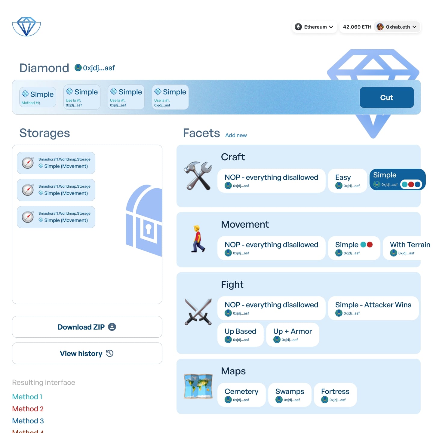A facet registry that displays facets on the constructor page without requiring meta logic inside facet contracts The facet registry is built on the ERC-1155 standard, and new diamonds and facets are represented as tokens with relevant metadata, such as the storage slot used by each facet. After deploying a Diamond instance, users can download a project template with pre-filled settings, making it easy to modify existing contracts, deploy and register new versions, and perform Diamond Cuts using the tool.